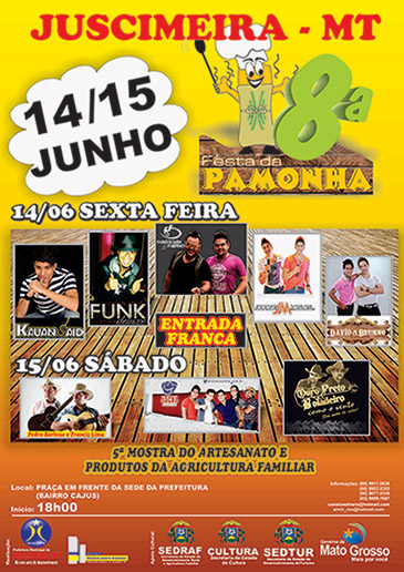 Nos dias 14 e 15 de junho será realizada em Juscimeira, a 8ª Festa da Pamonha. O evento, já tradicional no município, contará com uma ampla programação, com atrações musicais de vários estilos. Os organizadores esperam receber visitantes de várias regiões. Paralelamente será realizada a 5ª Mostra do Artesanato e Produtos da Agricultura Familiar.