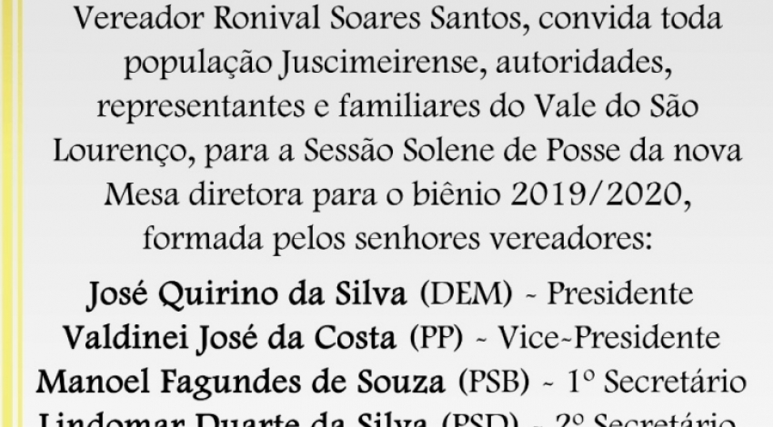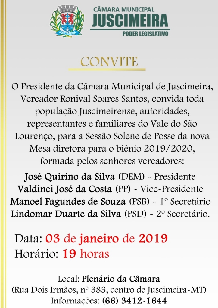 A Câmara Municipal de Juscimeira realizará nesta quinta-feira, dia 03 de janeiro de 2019, a partir das 19 horas, a Sessão Solene de posse à Nova Mesa Diretora para o biênio 2019/2020.