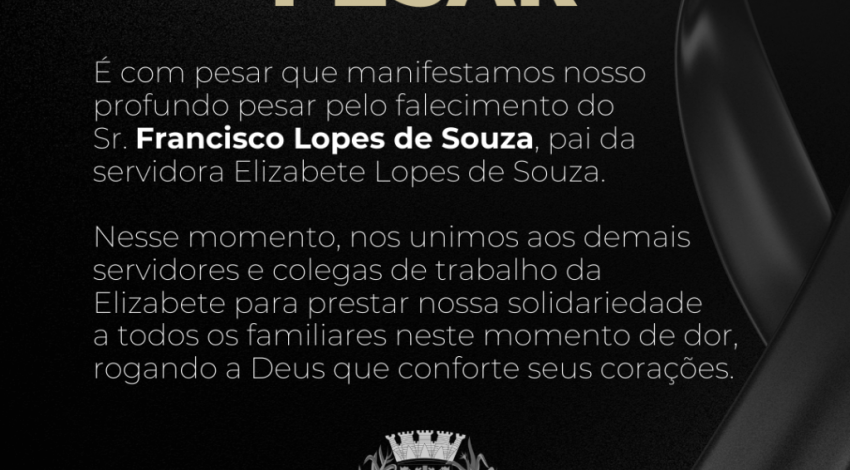É com pesar que manifestamos nosso profundo pesar pelo falecimento do Sr. Francisco Lopes de Souza, pai da servidora Elizabete Lopes de Souza.